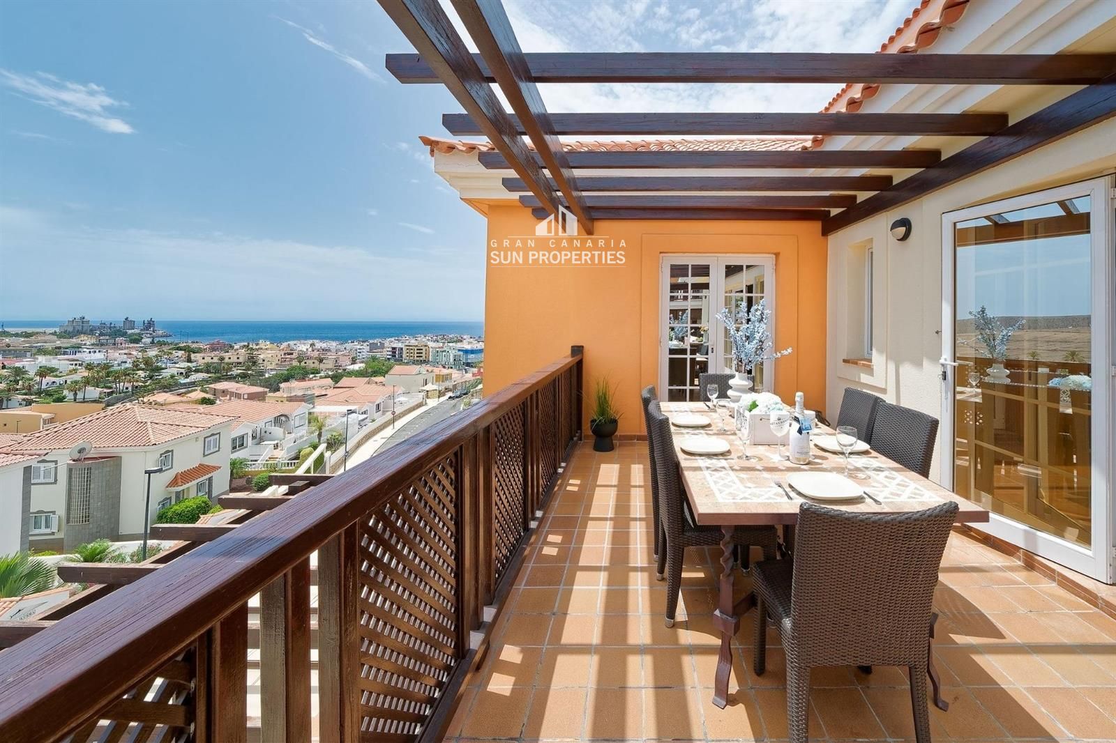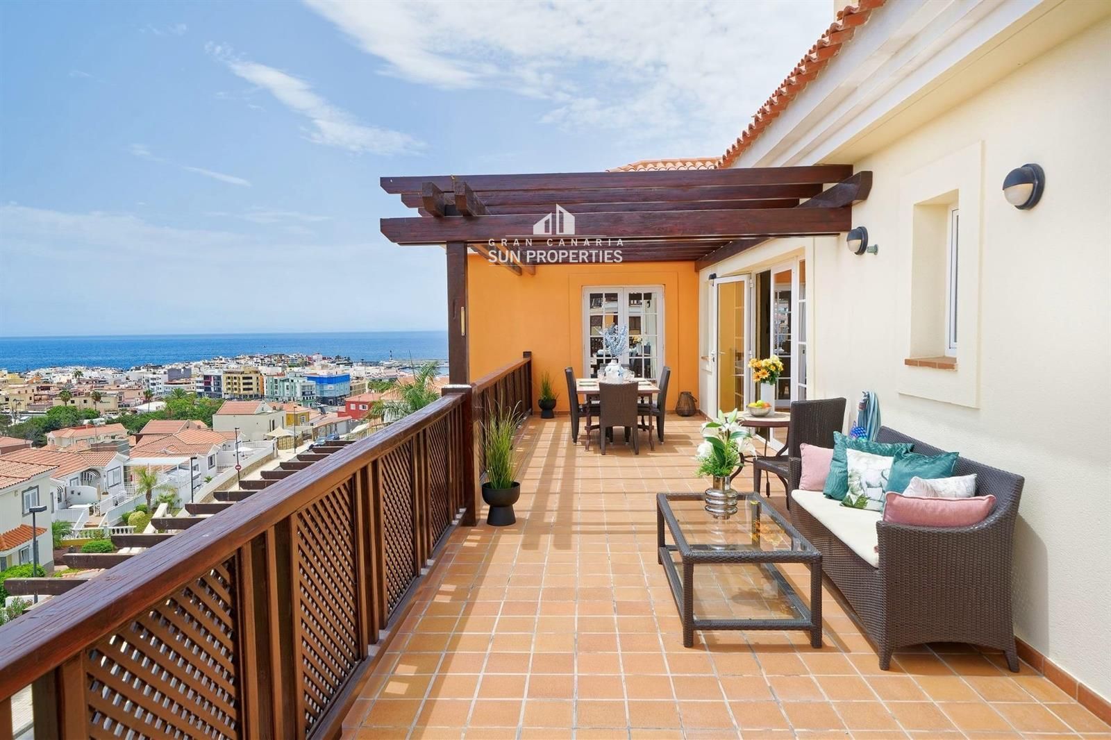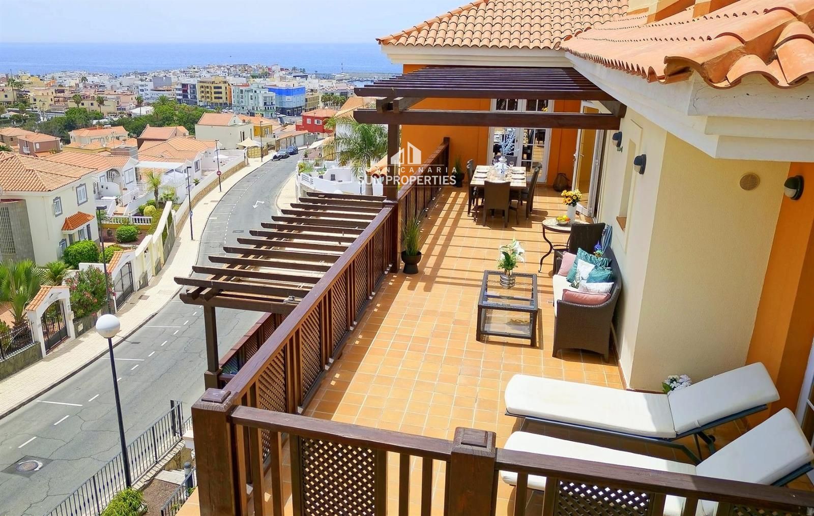Sehr geräumige, nach Osten ausgerichtete Terrasse mit Sonne ab dem frühen Morgen. Hier können Sie sich von Gran Canarias schönsten Sonnenaufgängen faszinieren lassen und die Sonne bis zum Nachmittag genießen. Ein großer Vorteil dieser Terrasse ist auch, dass sie oft windgeschützt ist. Abschließend sei noch erwähnt, dass der Abendblick von hier aus hervorragend ist, wenn alle Lichter der Stadt leuchten. Die Terrasse ist so groß, dass sie Platz für mehrere Möbelkombinationen und Sonnenliegen bietet.