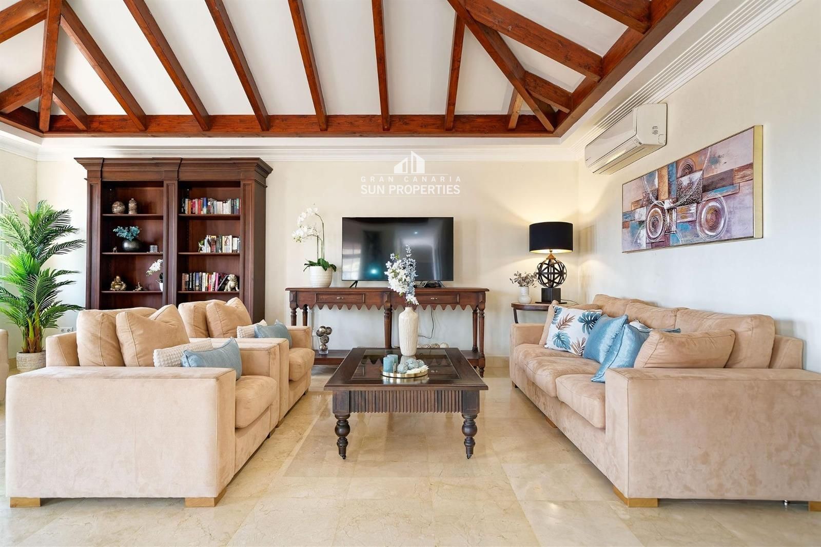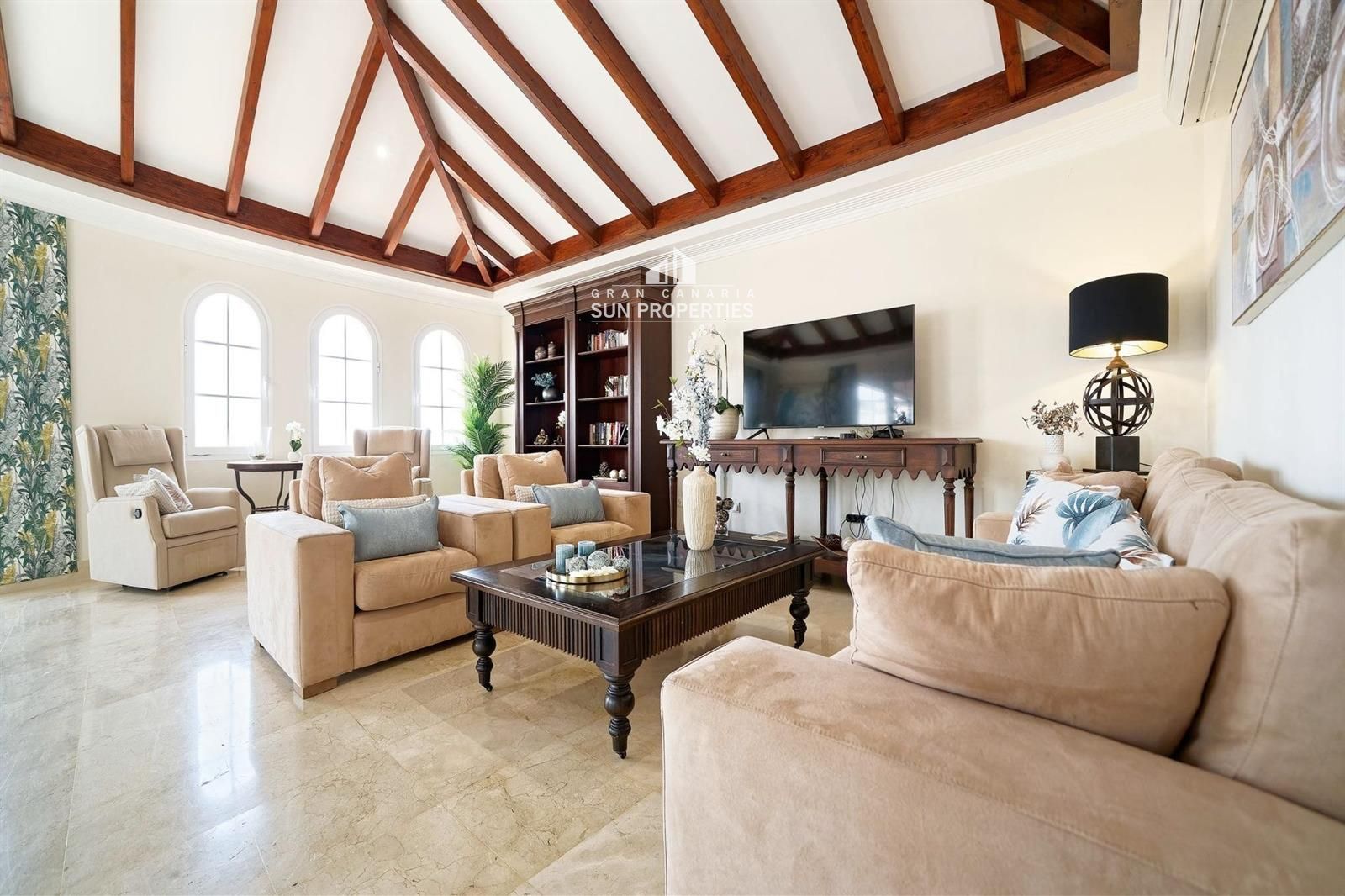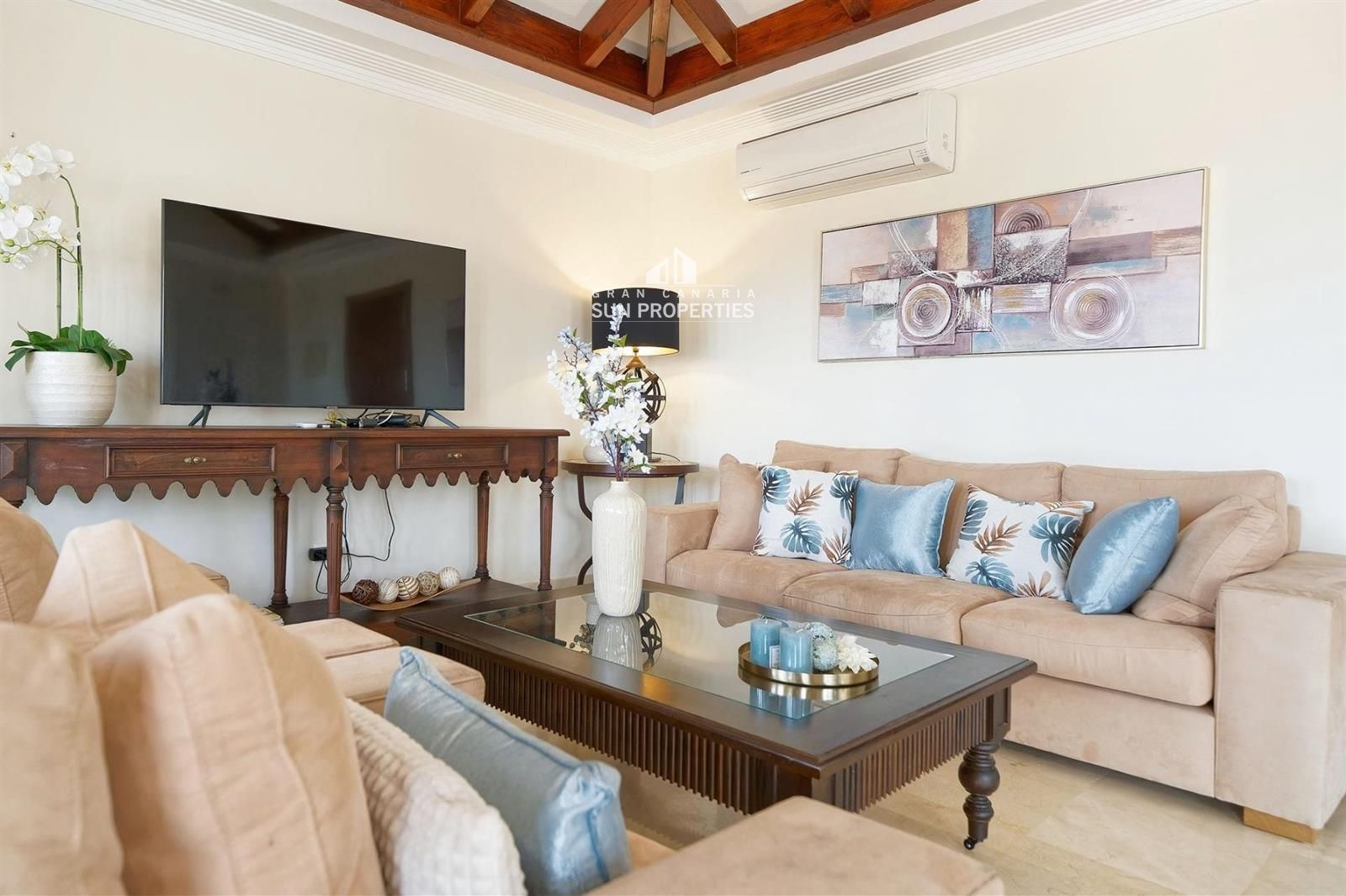 Das Apartment bietet auch das größte Wohnzimmer der Anlage mit wunderschönen, braunen, spanisch inspirierten Deckenbalken. Die Decke ist hoch und die hellen Wände, der Marmorboden und die speziellen Zierleisten schaffen eine zeitlose Eleganz. Hier ist Platz für mehrere Sitzgruppen. Das Wohnzimmer ist relativ quadratisch und somit sehr einfach einzurichten.