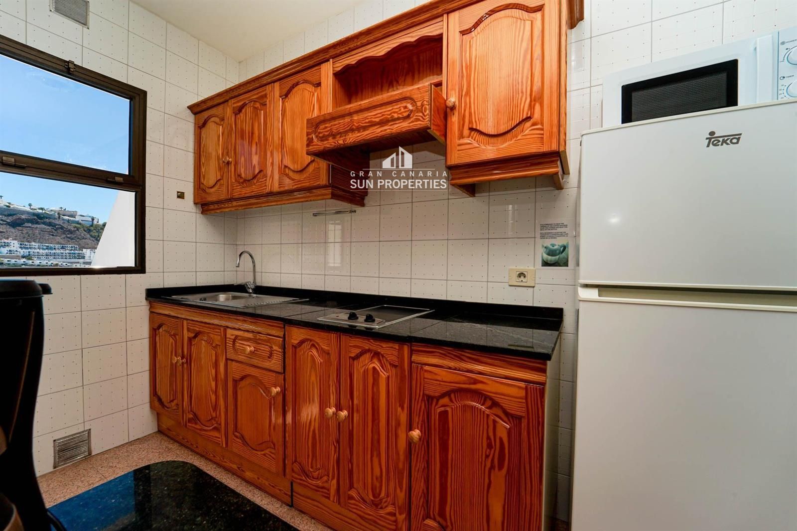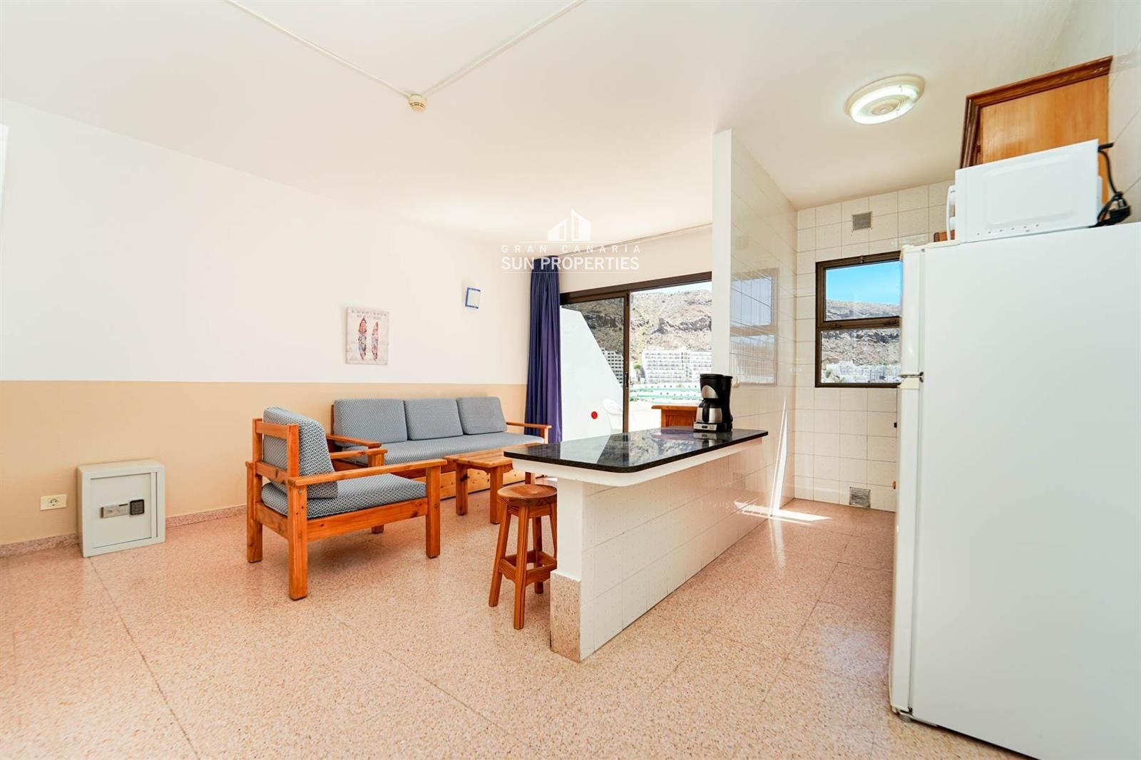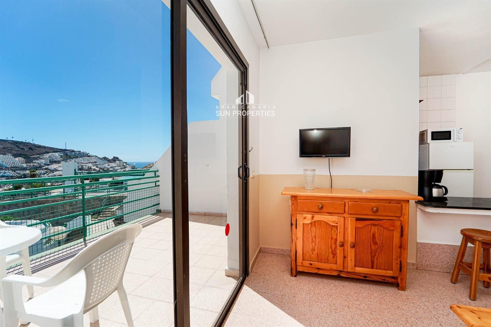Die Wohnung verfügt über ein helles Wohn- und Esszimmer mit Klimaanlage, eine ausgestattete Küche und eine private Terrasse, perfekt, um das ganzjährig milde Klima Gran Canarias zu genießen.