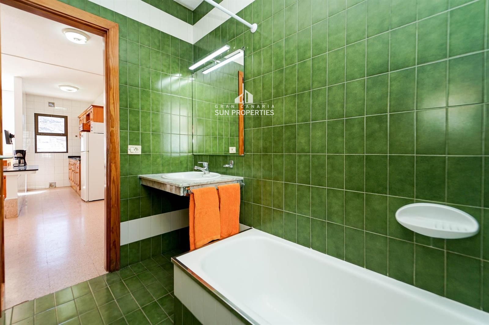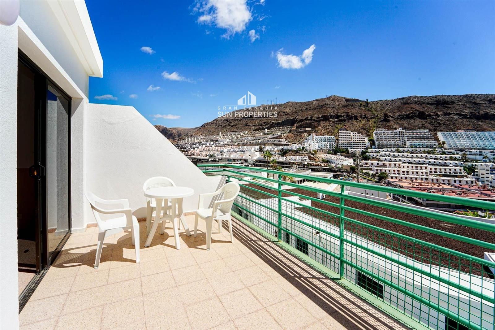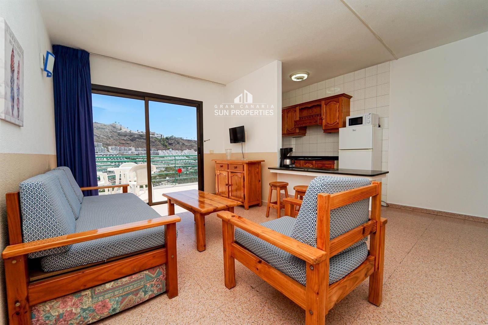 Die Wohnung verfügt über ein helles Wohn- und Esszimmer mit Klimaanlage, eine ausgestattete Küche und eine private Terrasse, perfekt, um das ganzjährig milde Klima Gran Canarias zu genießen.