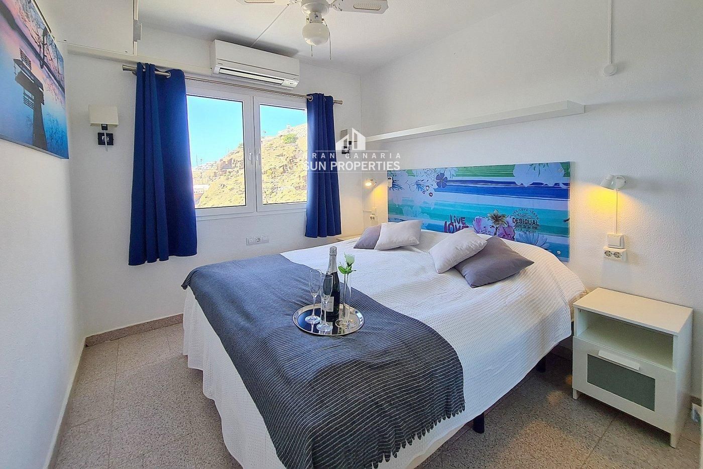The bedroom is furnished with a double bed and white bedside tables. Air conditioning. Ceiling fan. Extra sockets have been set up over the bedside tables. Built-in wardrobe with mirror. Storage shelves inside. Safe. Window. Good ventilation options. Beautiful sea views also in from the bedroom.