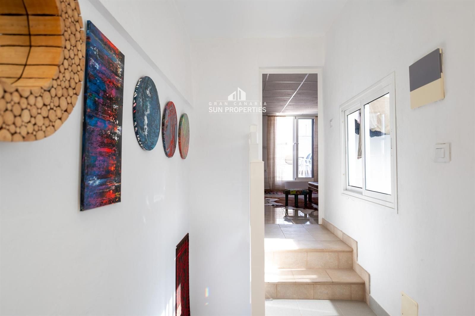 On the ground floor, access is through a small outdoor area that serves as an entrance terrace, with enough space for a small table and several chairs, creating a pleasant outdoor reception area. From here, you enter the home into an open-plan space that combines the living room, dining area and kitchen, offering an elegant, comfortable and functional layout. A full bathroom is also located on this floor, at the rear of the property.