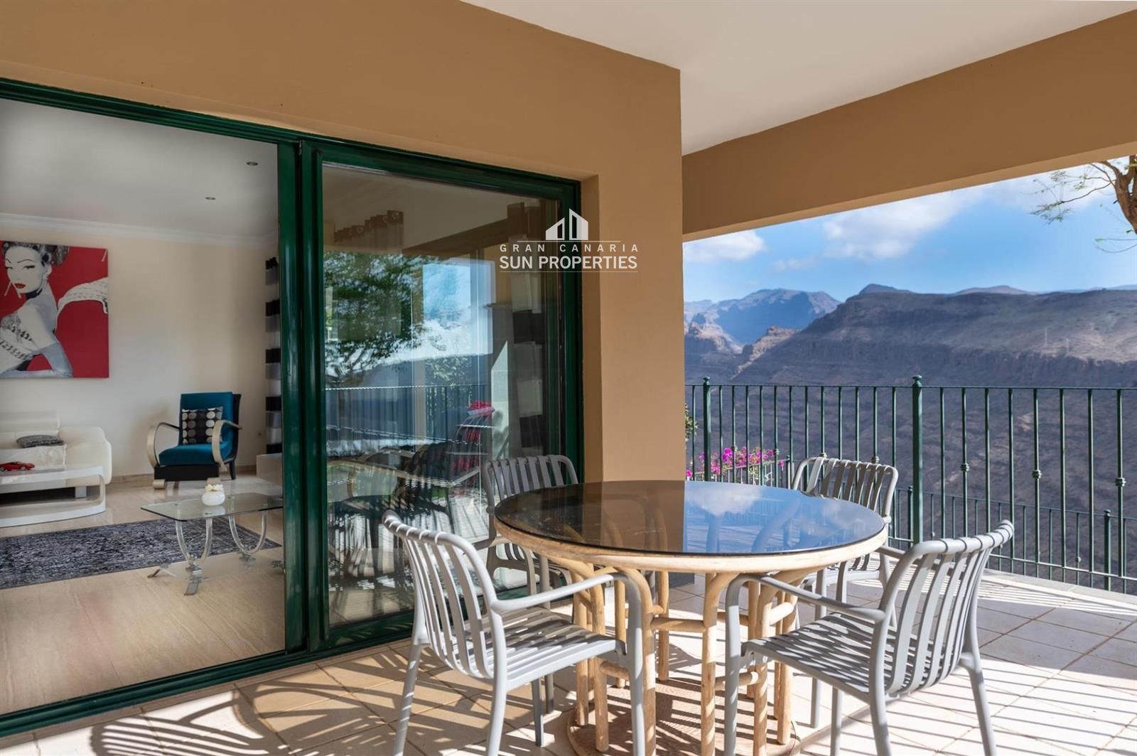 En la planta principal se ubica un espacioso y luminoso salón con acceso directo a una gran terraza que rodea la casa y ofrece vistas panorámicas al valle de Ayagaures y hasta Maspalomas. Desde la terraza cubierta, perfecta como zona de comedor exterior, se accede a la piscina y al jardín.