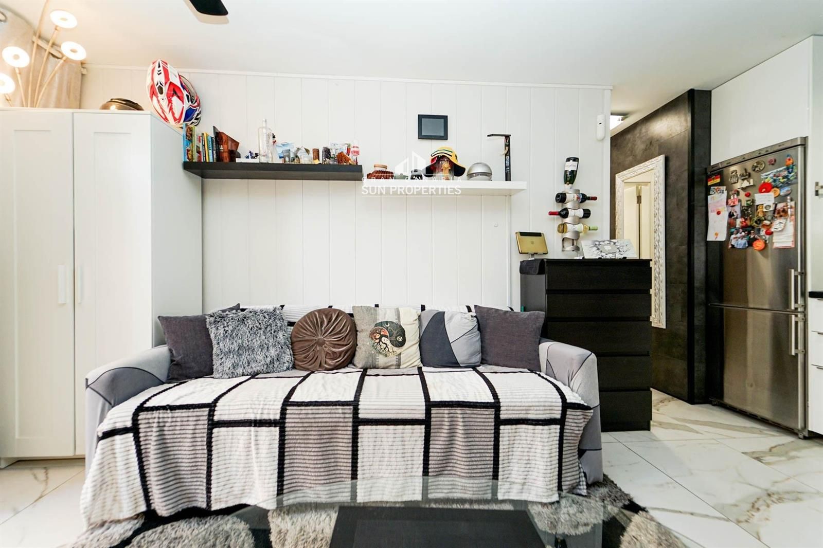 Vardagsrum med kök i amerikansk stil, 1 sovrum, badrum och terrass.